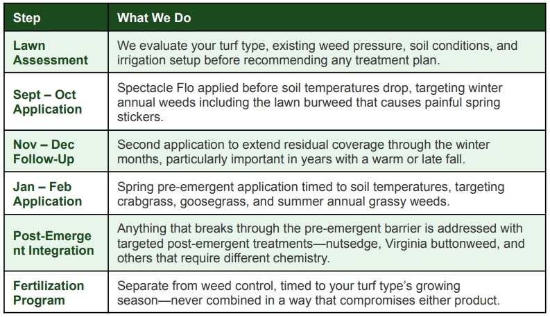 �� Pro Tip: Soil temperature—not calendar date—is the true trigger for pre-emergent timing. In unusually warm falls, the September application may need to come earlier. In unusually cool years, there may be some flexibility. Our technicians monitor local soil temps to optimize every application.